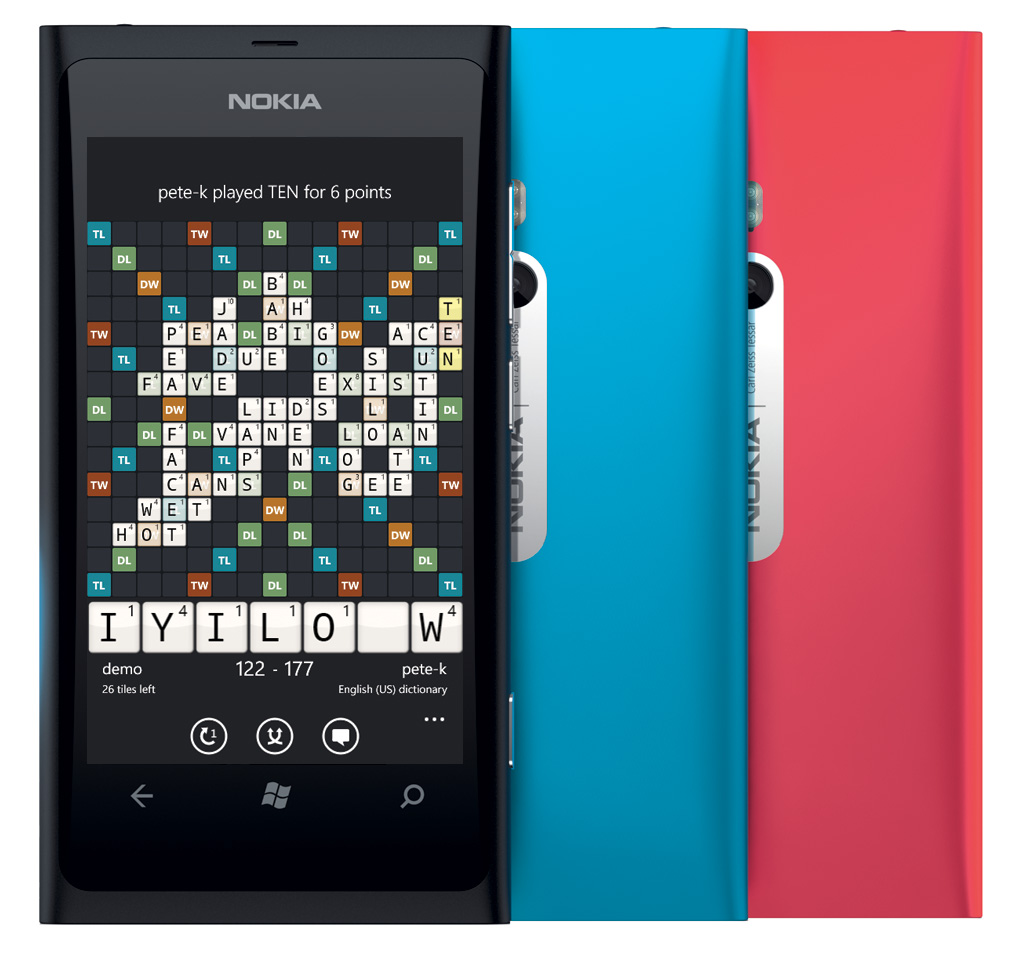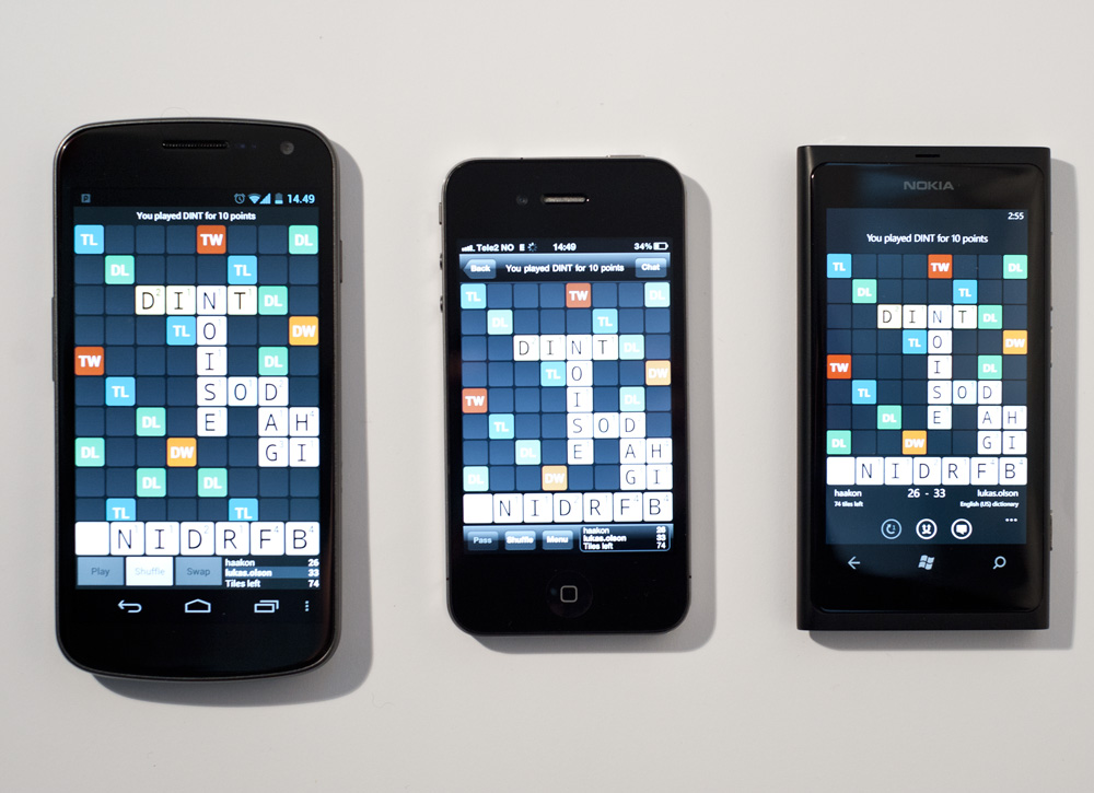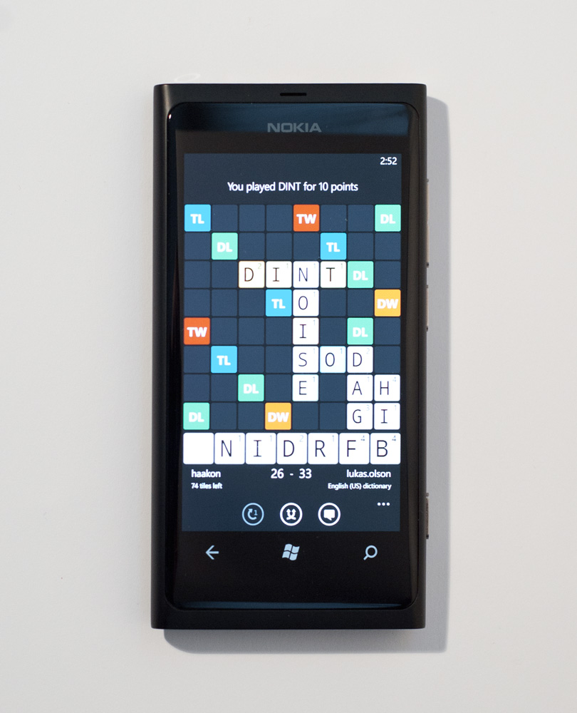 The Wordfeud family will soon have a new member, as Wordfeud for Windows Phone is nearing completion. We plan to release it on Februrary 1. This coincides with the Nokia Lumia 800 launch in Norway and Sweden. As you can see from the photos, the Nokia has been Team Wordfeud’s main WP7 dev phone.