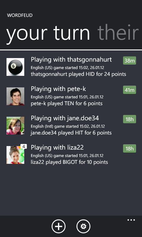 We’ve made a few small changes here and there as part of adapting the game for the Windows Phone platform. But if you’ve played Wordfeud before you’ll feel right at home with the Windows Phone version. Perhaps the most exciting difference is that Wordfeud for Windows Phone features Live Tiles. On the front you’ll find the number of games waiting for you as well as an unread chat indicator. On the back there’s a brief summary of the last move as well as the opponent’s profile picture.