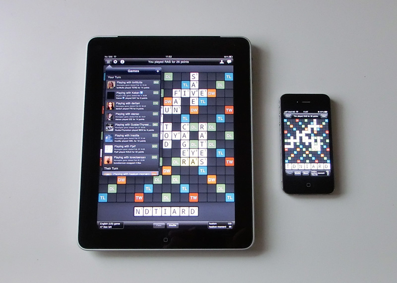 The current Wordfeud version has some annoying bugs that affect users playing on the iPad. Tiles can be hard to pick up from the rack, and the game list may appear when a tile is picked up when the iPad is held in the portrait orientation. This is caused by some changes Apple made in iOS 5.1. It also causes Wordfeud to crash if attempting to remove finished games.
