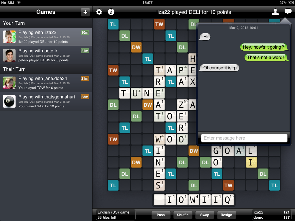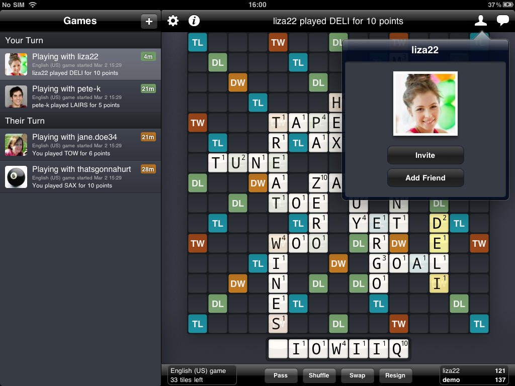 There’s also a memory leak that affects users playing on the iPhone. The game board may turn black after playing a while, in which case it’s necessary to restart Wordfeud.